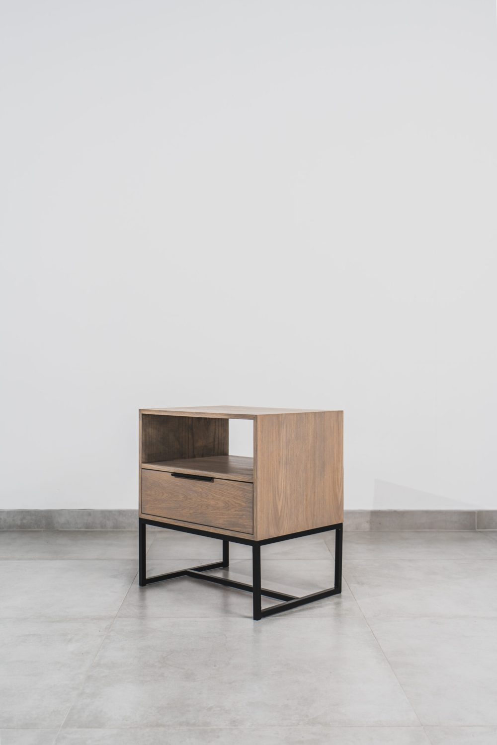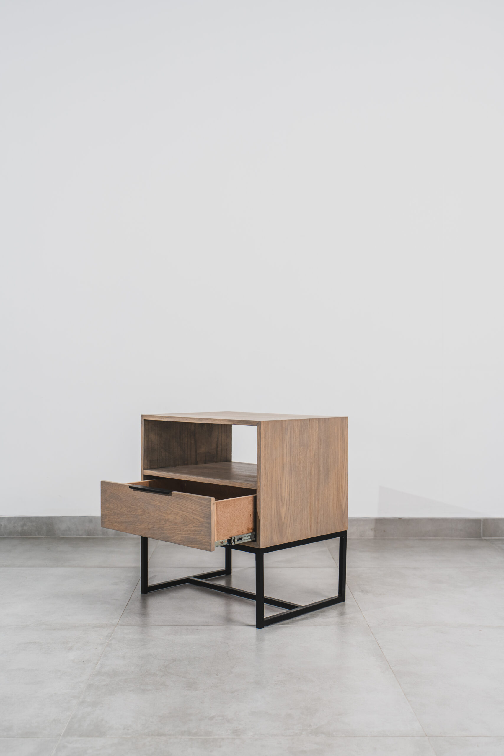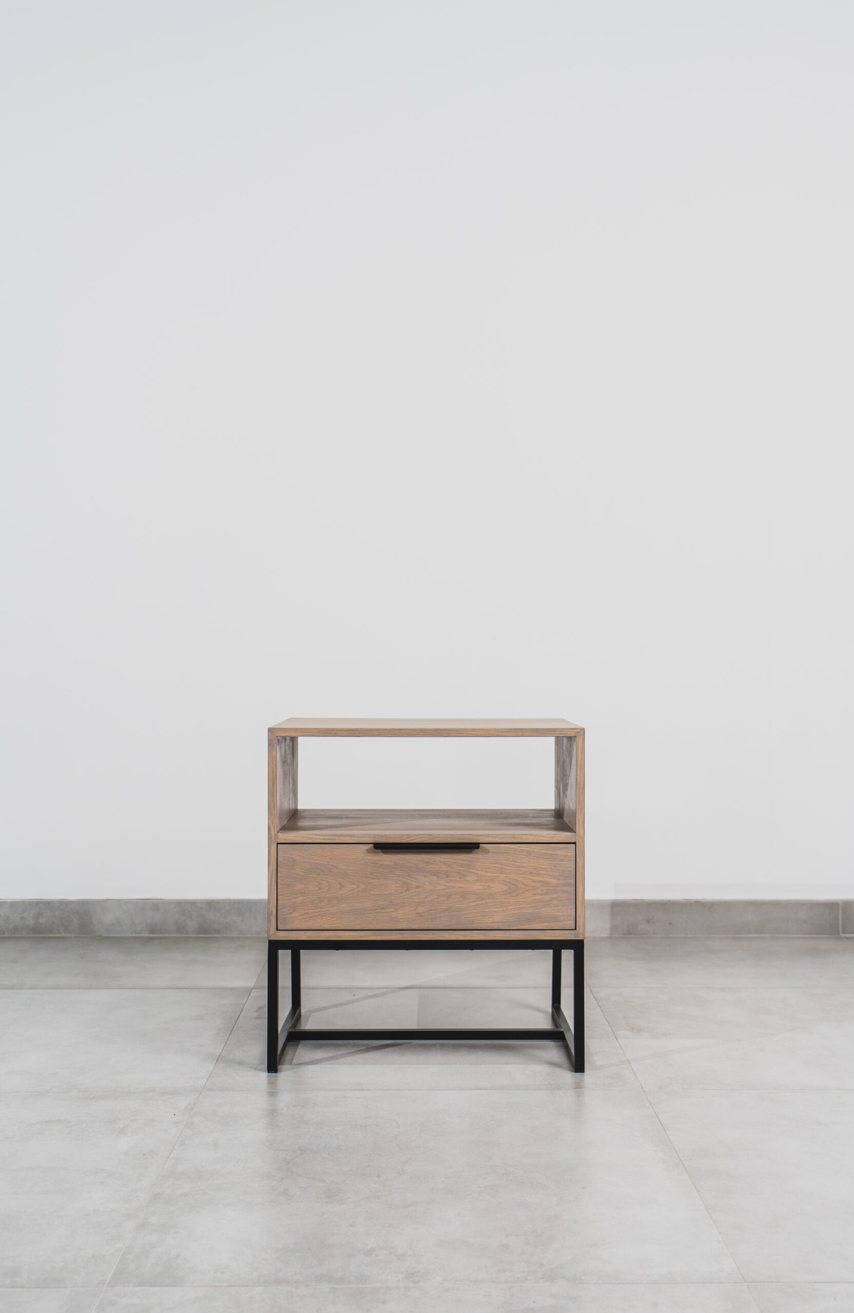 Upgrade your space with our Grey Oak Single-Drawer Pedestal! Featuring a sleek single drawer for discreet storage, an open shelf for easy access to essentials, and a sturdy metal base for a contemporary touch, this pedestal perfectly balances style and functionality.