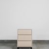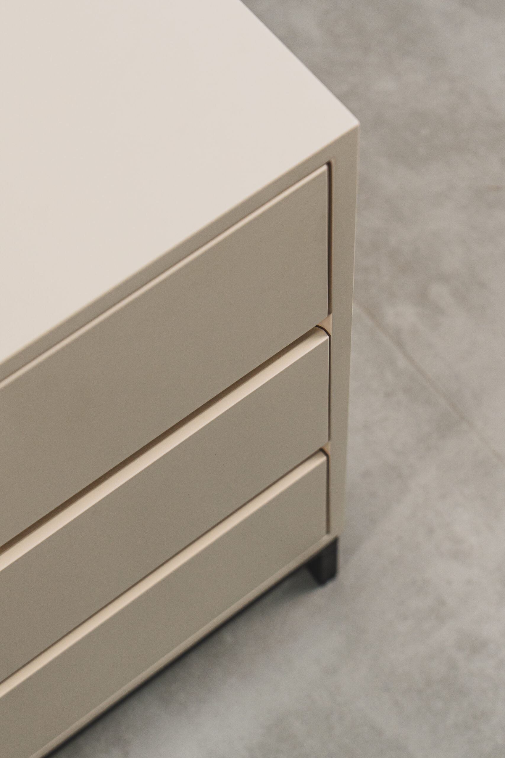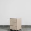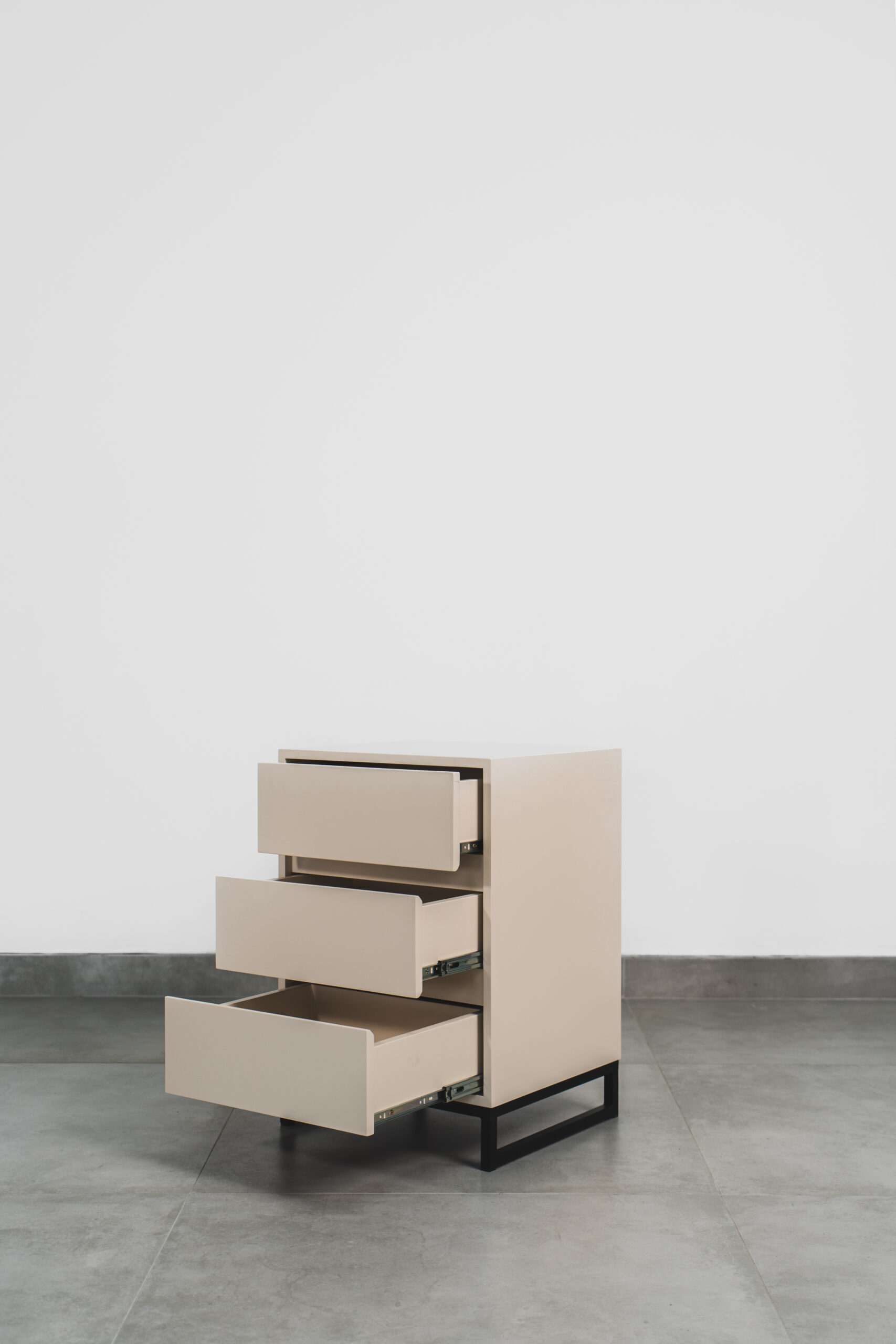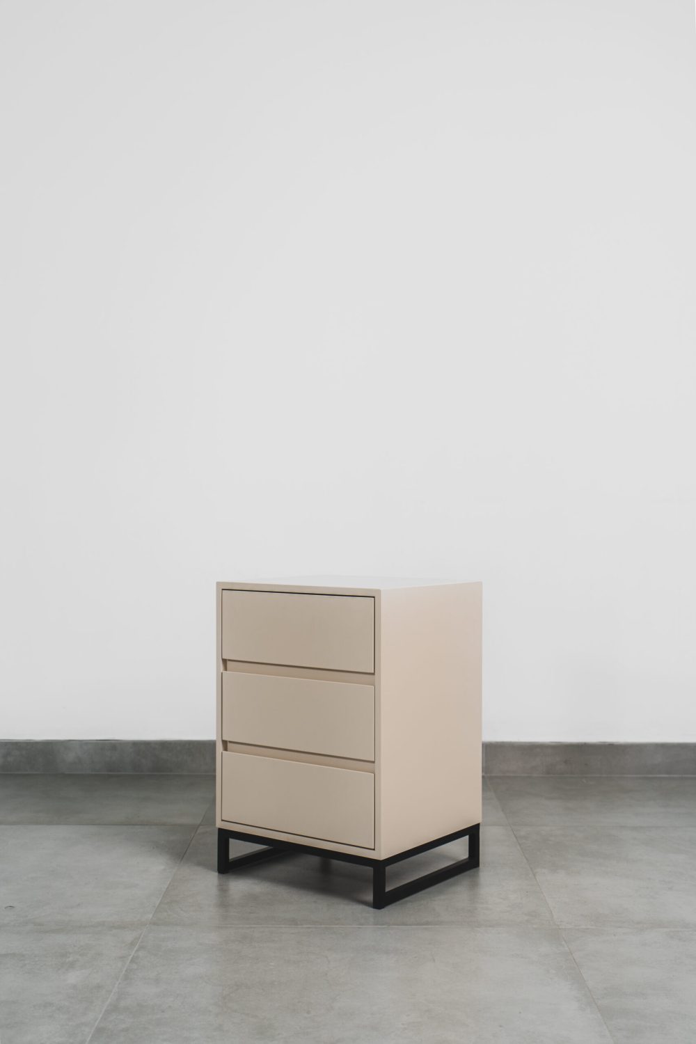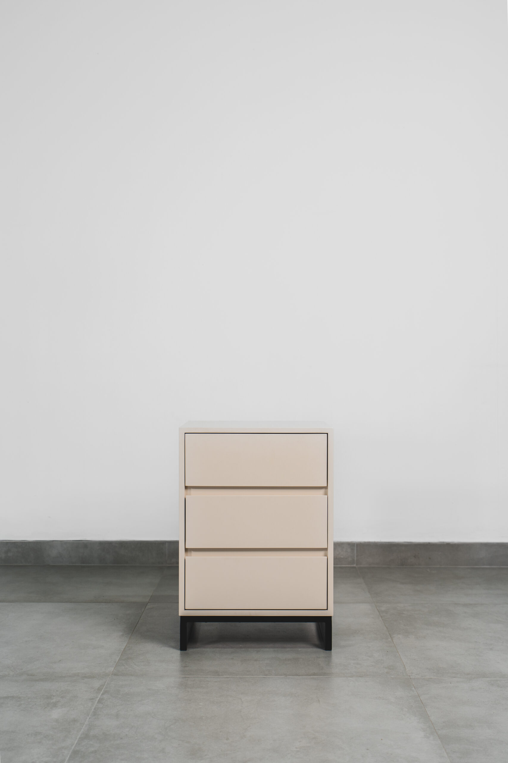Elevate your bedroom decor with our elegant Beige Bedside Table, complete with three convenient drawers and a contemporary black steel base. Designed for both style and functionality, this chic piece adds a touch of sophistication while providing ample storage space. Organize your essentials in style and transform your bedroom into a haven of modern luxury.
