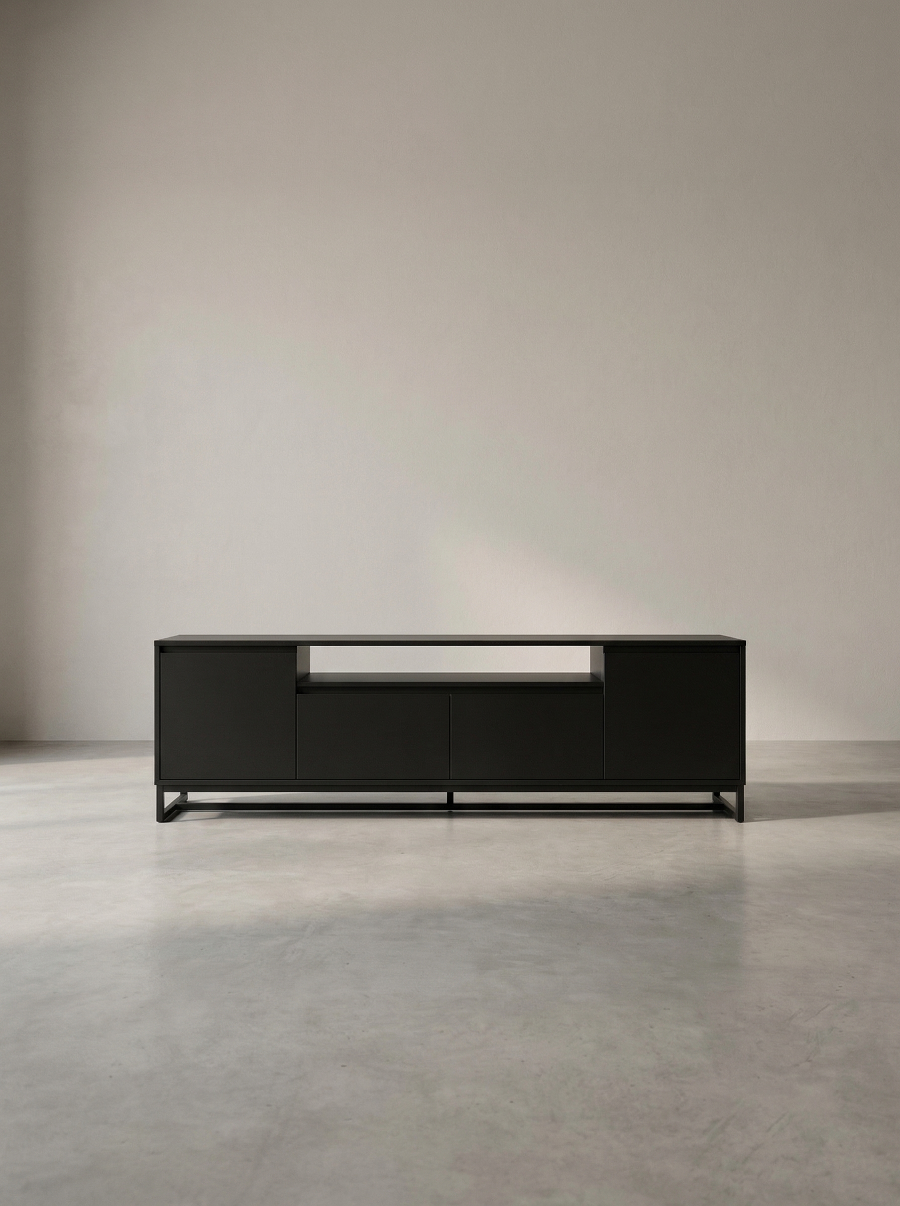This modern TV unit features a sleek, all-black design that brings a bold, contemporary edge to any living room. Its smooth surfaces and minimalist lines create a clean, cohesive look, while the practical storage compartments keep media devices and accessories neatly organised. A simple yet striking piece that delivers both style and functionality.