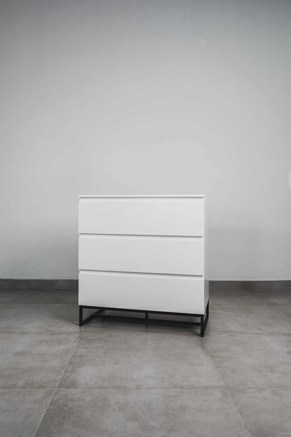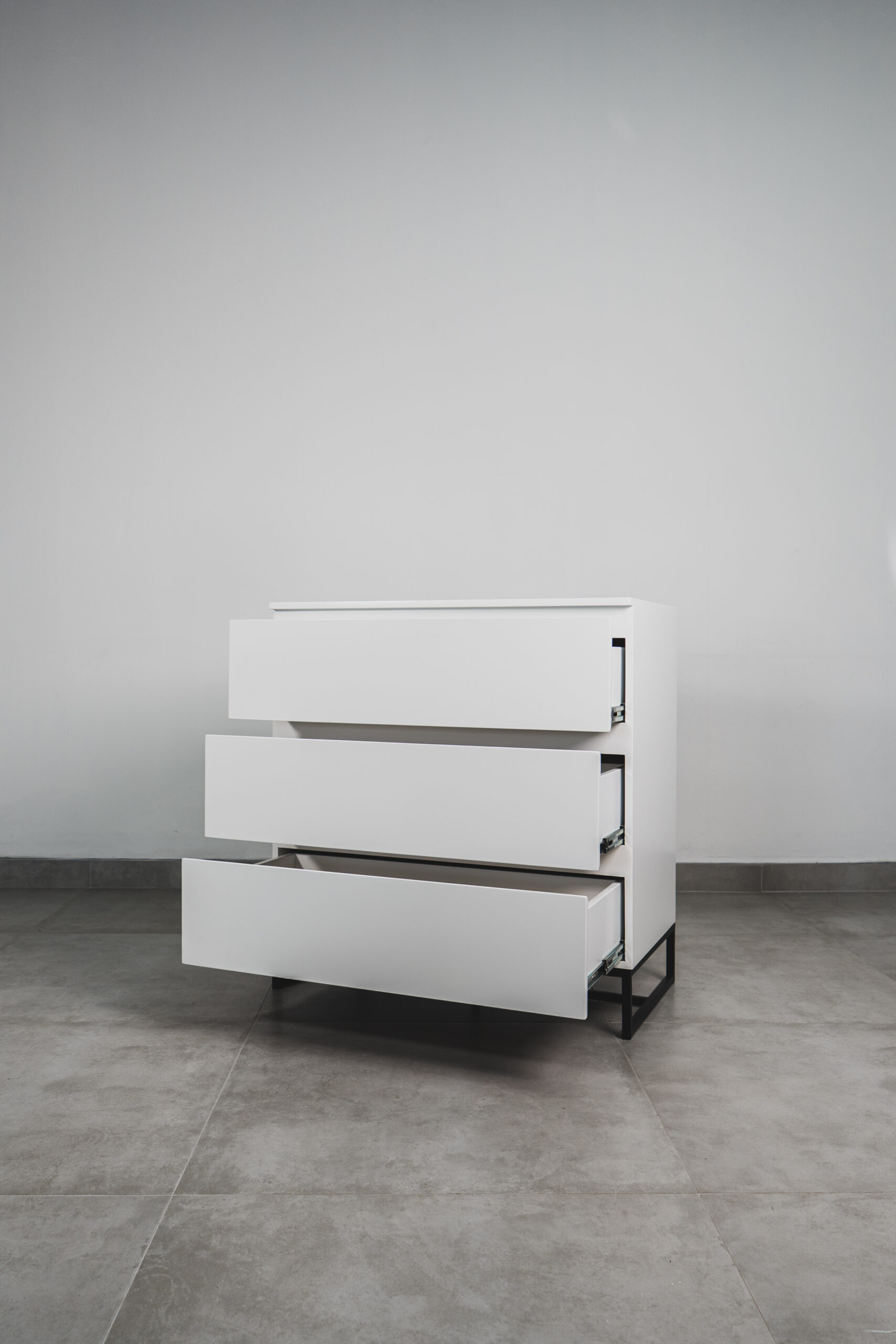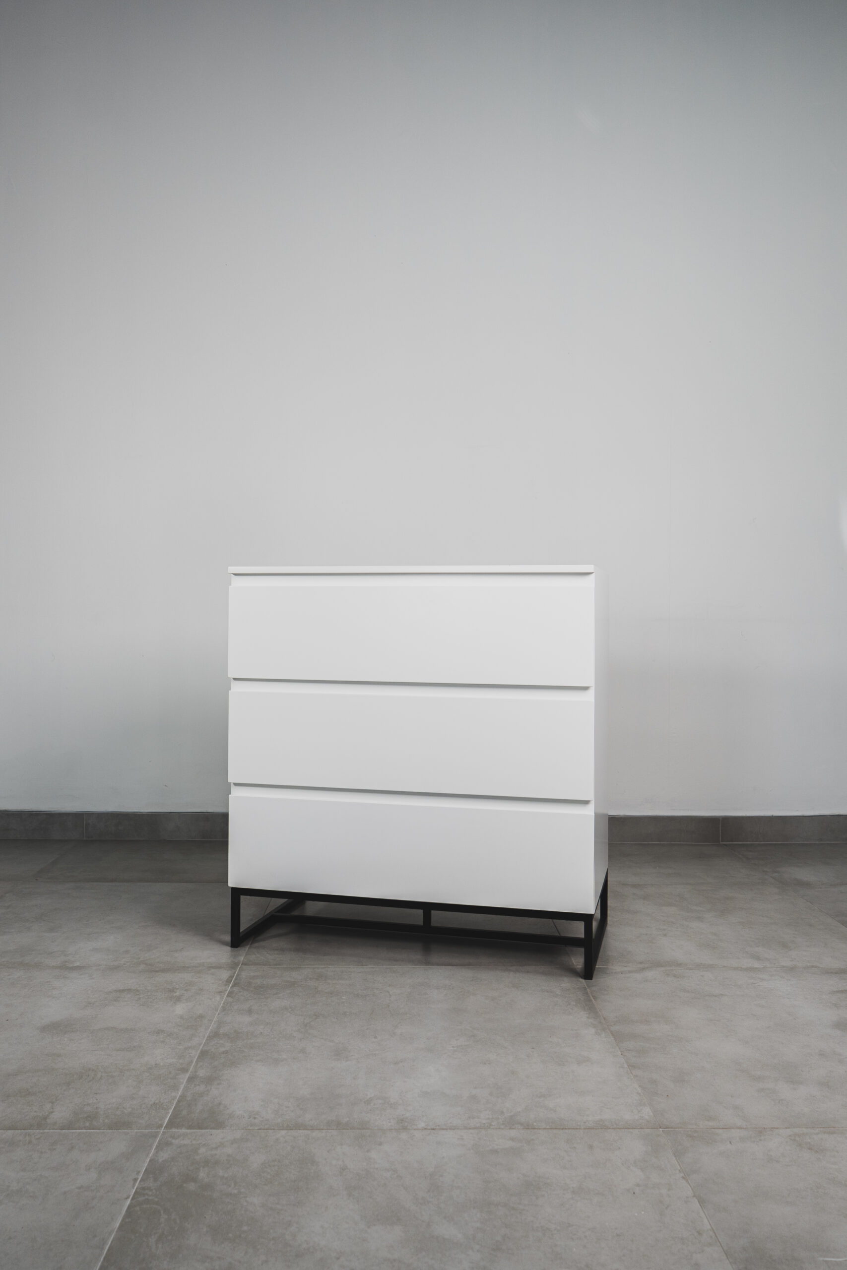 This chic white chest of drawers combines modern design with functional elegance. It features three spacious drawers, each with sleek shadow handles that add a touch of sophistication. The chest sits on a sturdy black metal base, creating a striking contrast that enhances its contemporary appeal. Perfect for any bedroom or living space, this piece offers ample storage while serving as a stylish focal point. It’s in excellent condition and ready to complement your home décor.
