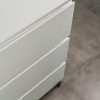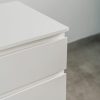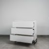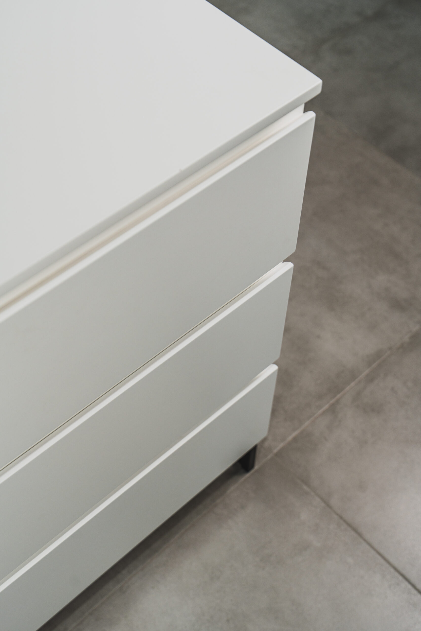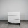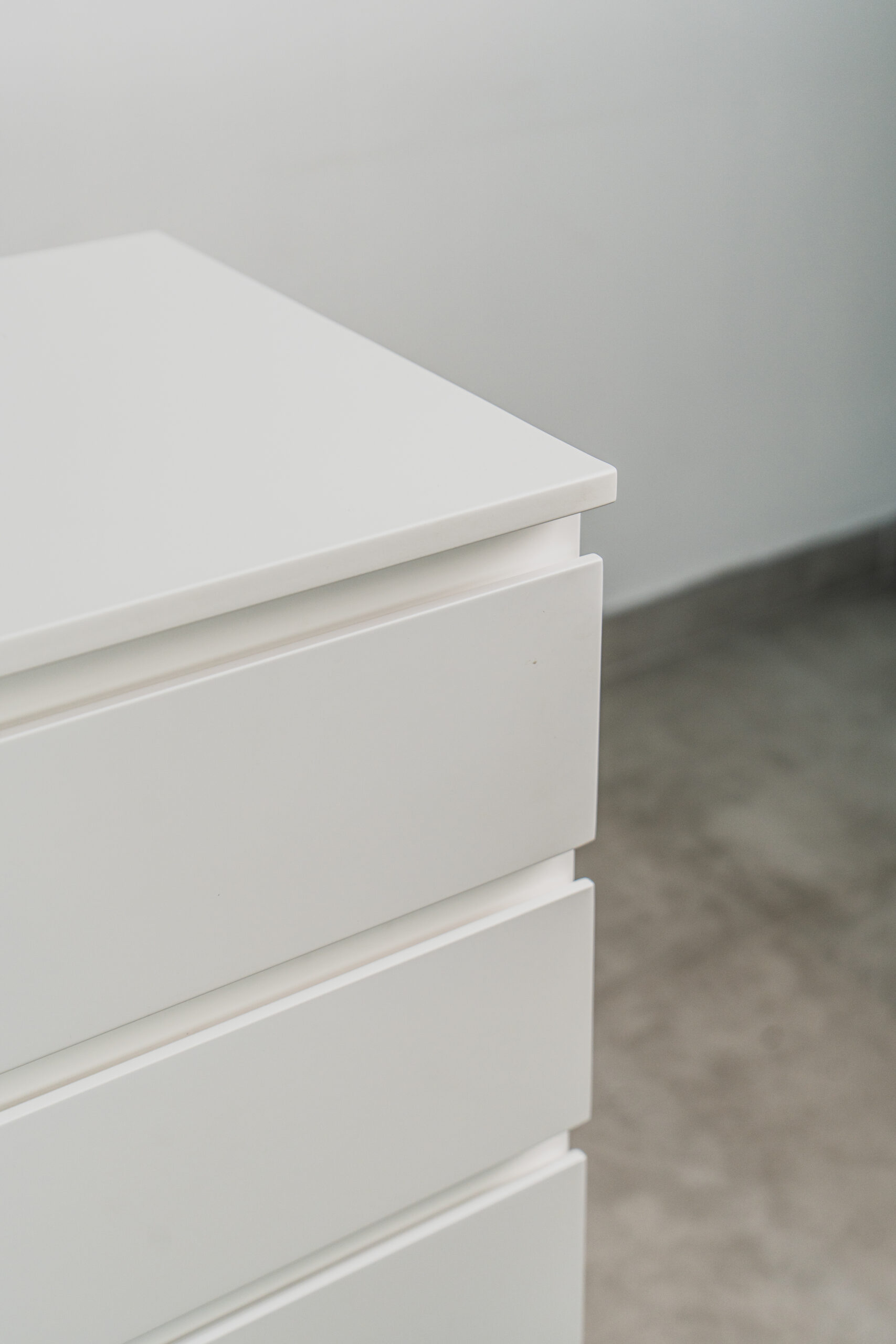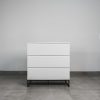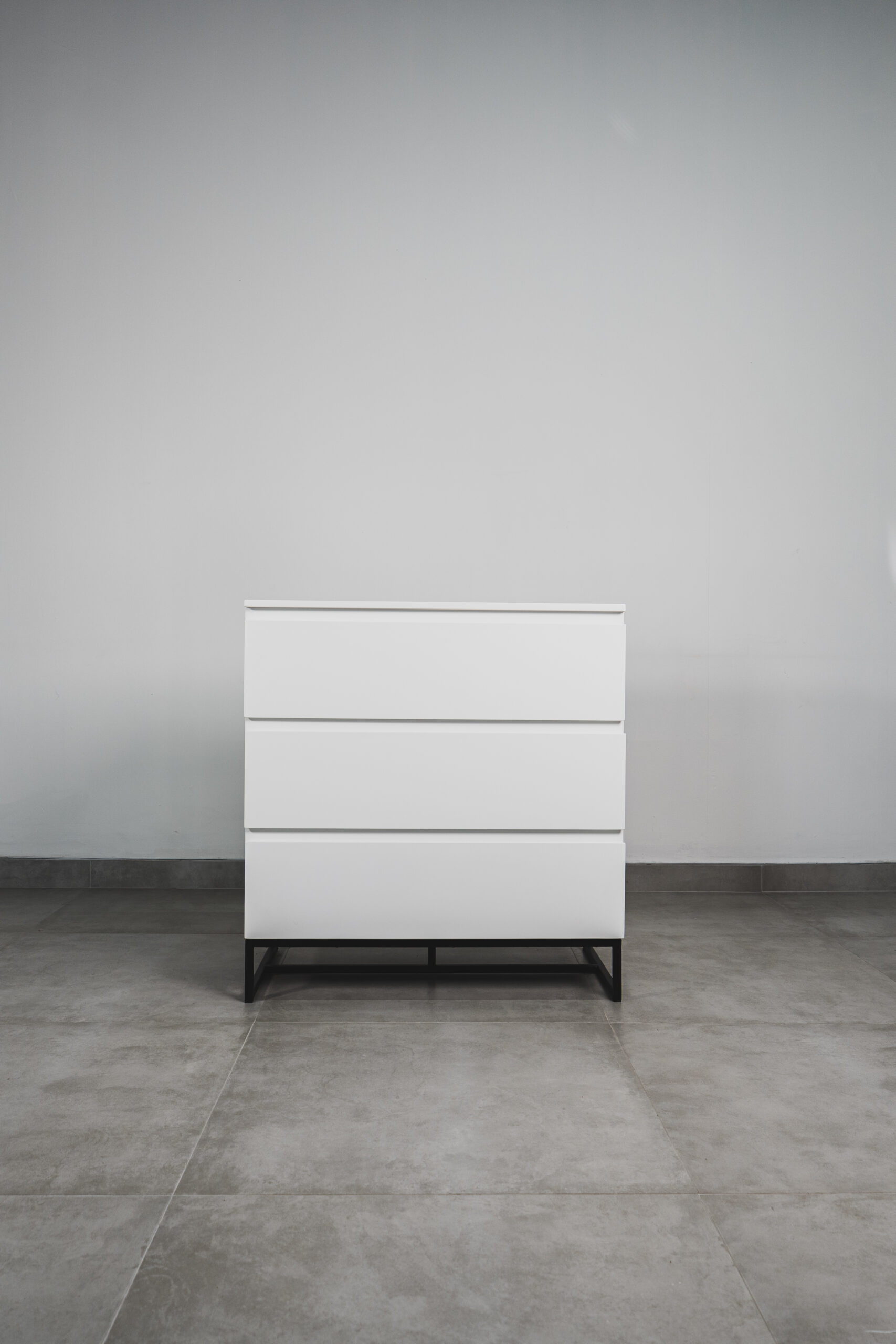 This chic white chest of drawers combines modern design with functional elegance. It features three spacious drawers, each with sleek shadow handles that add a touch of sophistication. The chest sits on a sturdy black metal base, creating a striking contrast that enhances its contemporary appeal. Perfect for any bedroom or living space, this piece offers ample storage while serving as a stylish focal point. It’s in excellent condition and ready to complement your home décor.