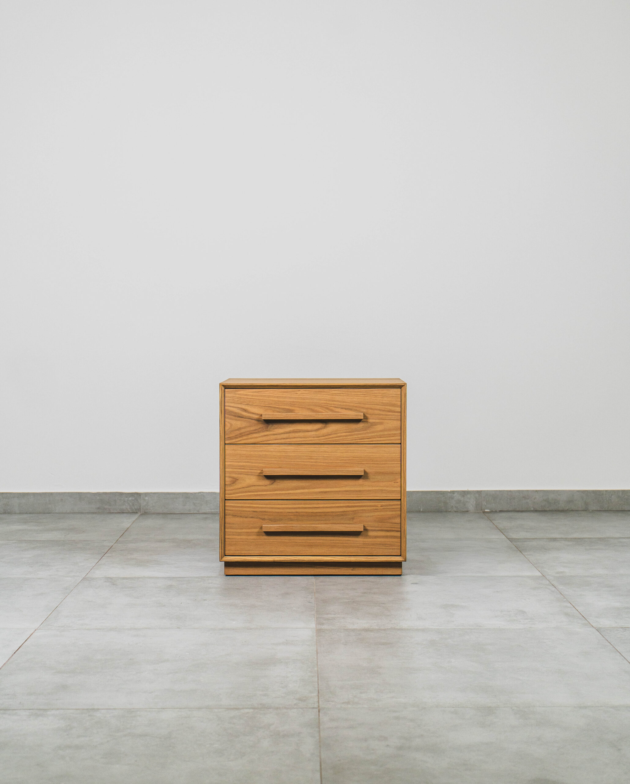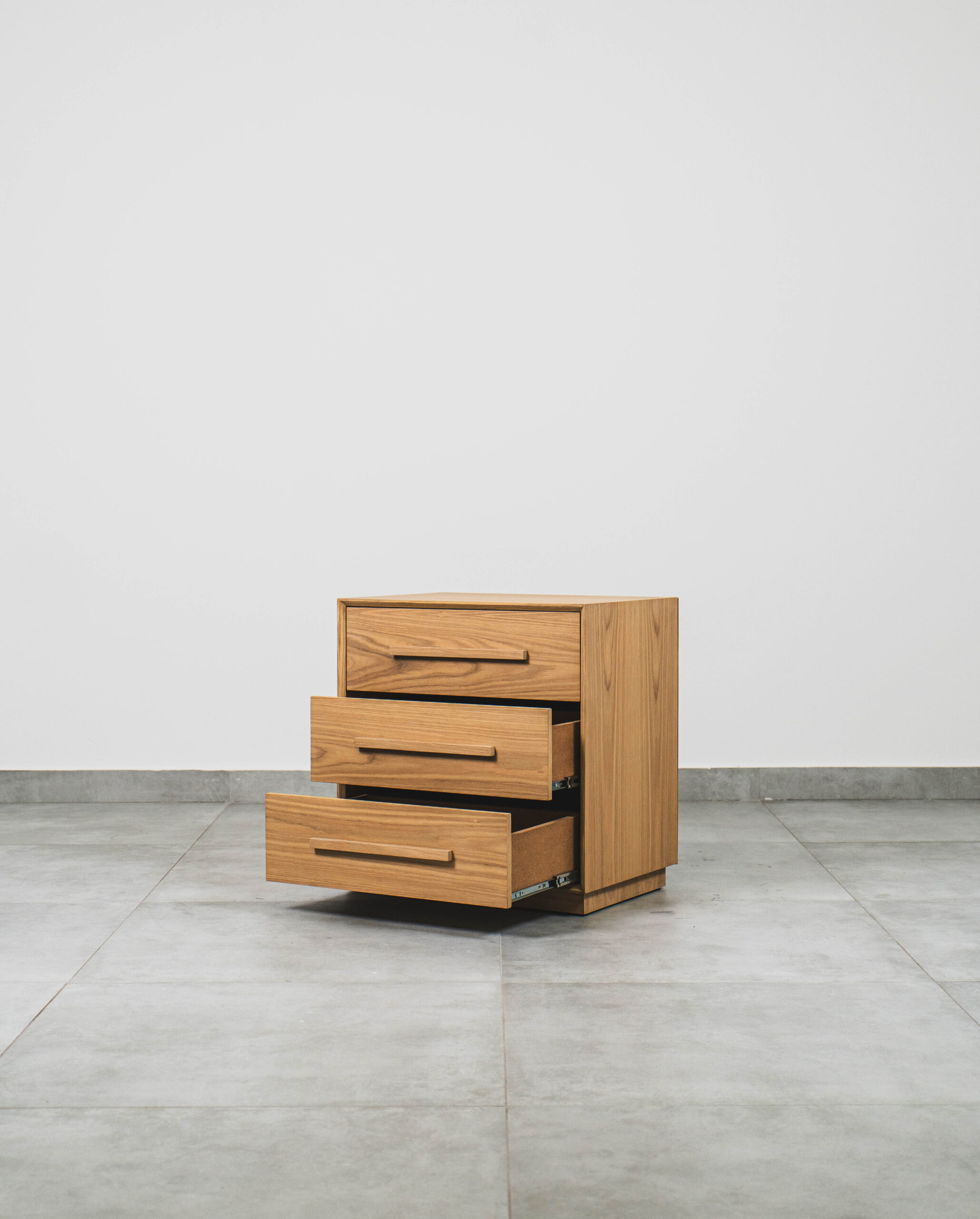 This 3-drawer pedestal, crafted in a natural oak veneer, offers a sleek and functional storage solution for any room. Designed with three spacious drawers, it’s ideal for bedside essentials, office items, or everyday storage. The wooden handles and matching wooden base add warmth and continuity, enhancing its clean, modern aesthetic. Measuring 650 x 450 x 650H, it’s perfectly proportioned for use as a bedside table or compact side unit. A versatile, stylish piece that complements a wide range of interiors.